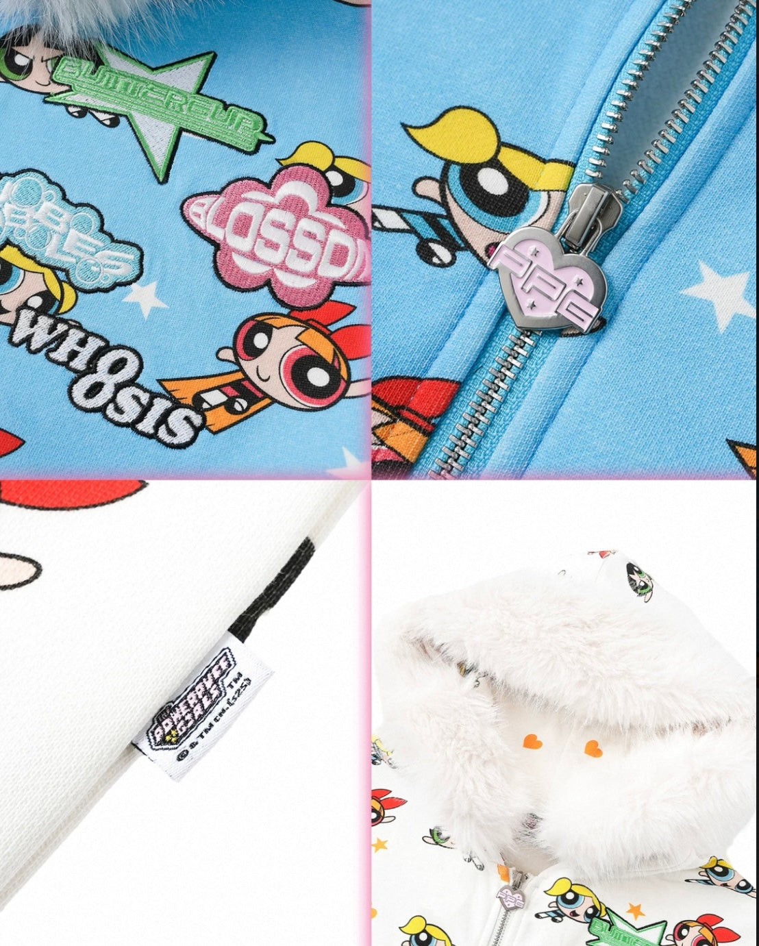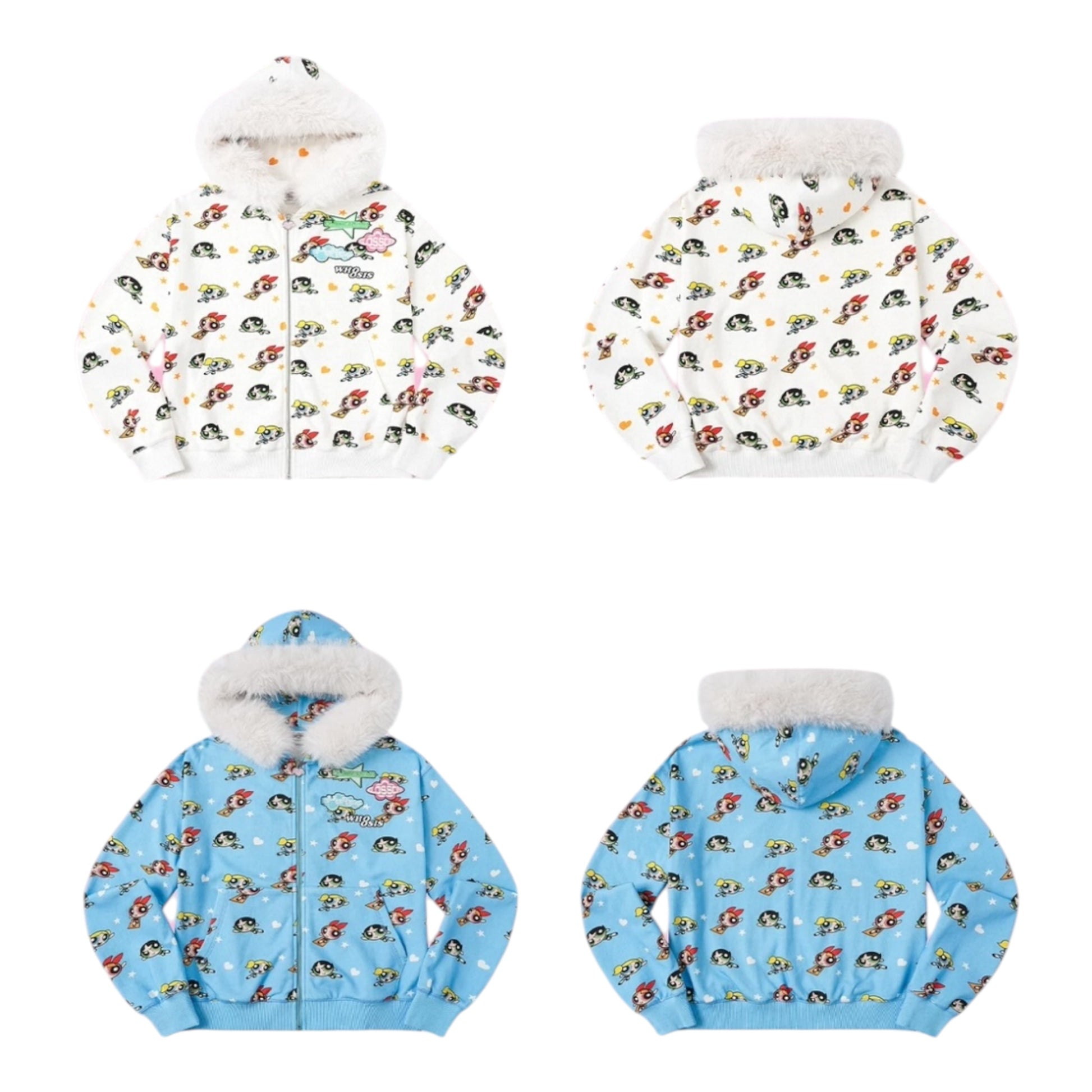 連帽設計搭配舒適毛領,衣身布滿飛天小女警主題圖案,整體風格活潑可愛。